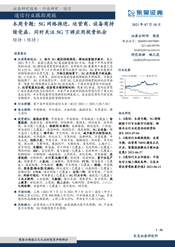 【东吴证券】【20210718】20210718-东吴证券-通信行业跟踪周报:本周专题:5G网络推进,运营商、设备商持续受益,同时关注5G下游应用投资机会-36页