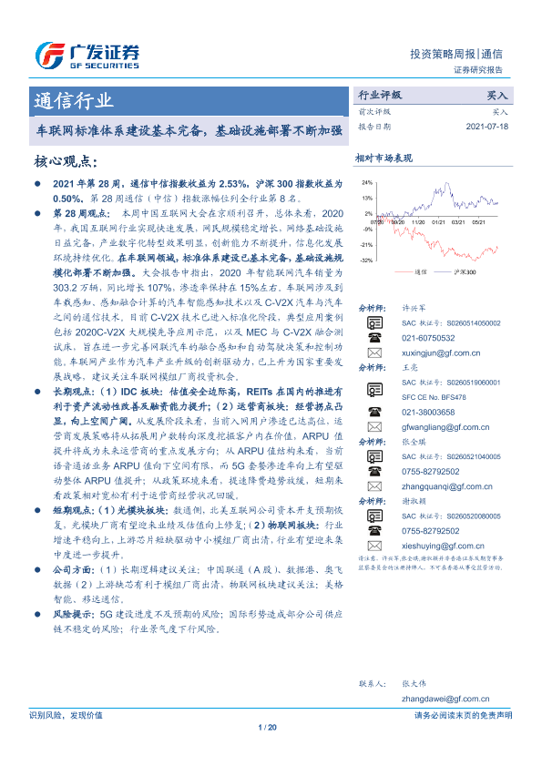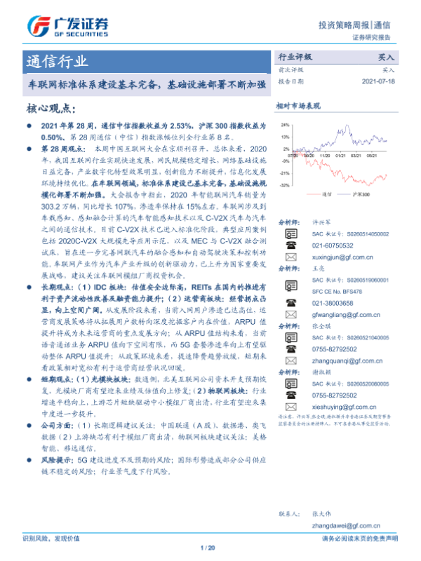 【广发证券】【20210718】20210718-广发证券-通信行业投资策略周报:车联网标准体系建设基本完备,基础设施部署不断加强-20页