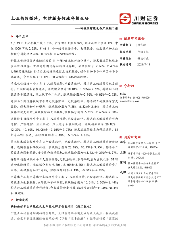 【川财证券】【20210719】科技及智能设备产业链日报:上证指数微跌,电信服务领涨科技板块-3页
