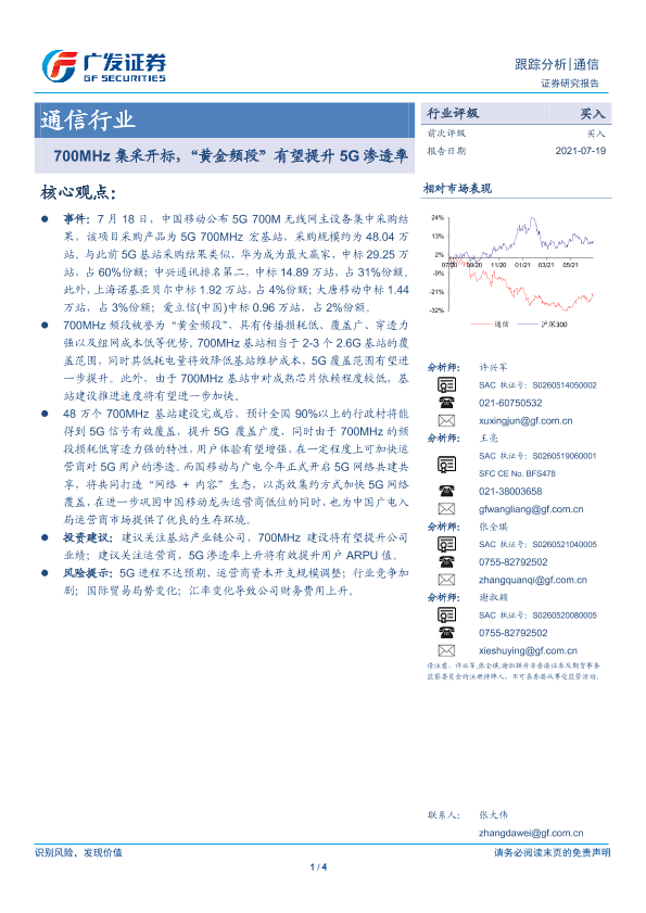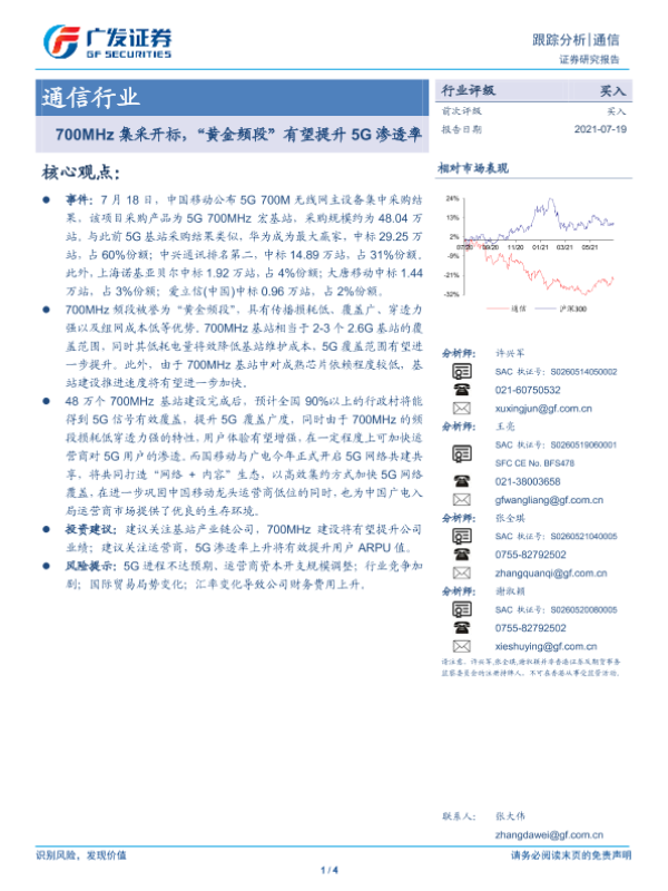 【广发证券】【20210719】通信行业:700MHz集采开标,“黄金频段”有望提升5G渗透率-4页