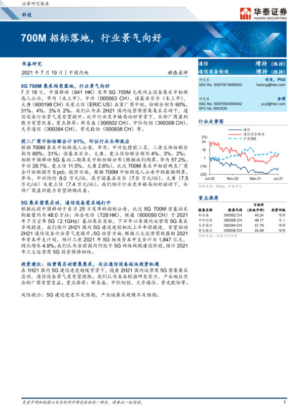 【华泰证券】【20210719】通信:700M招标落地,行业景气向好-6页