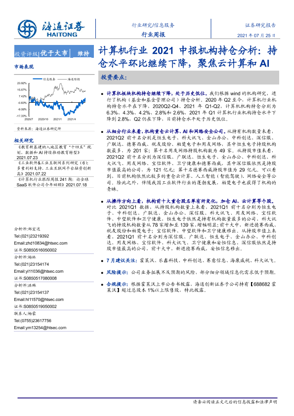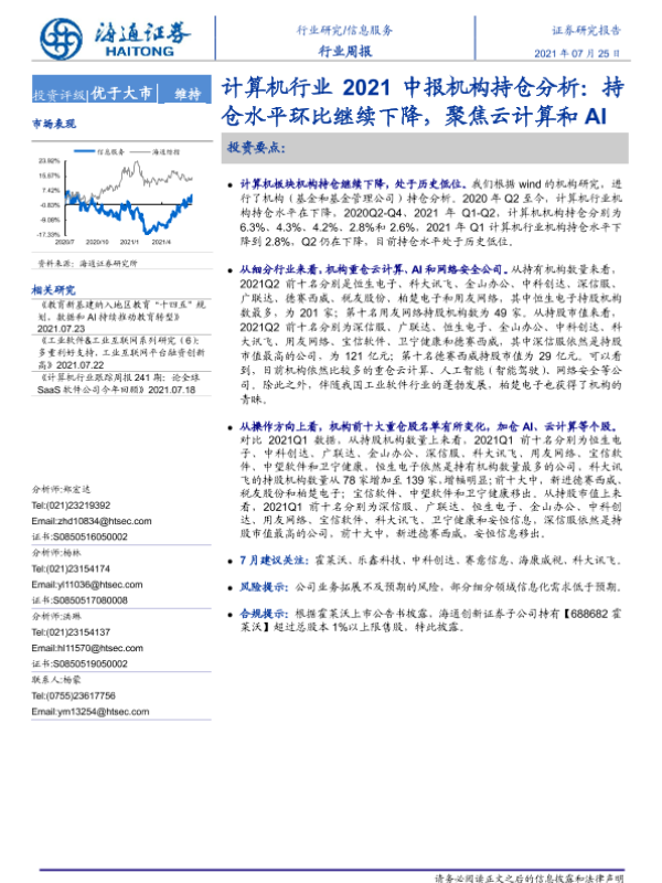【海通证券】【20210725】计算机行业2021中报机构持仓分析:持仓水平环比继续下降,聚焦云计算和AI-4页