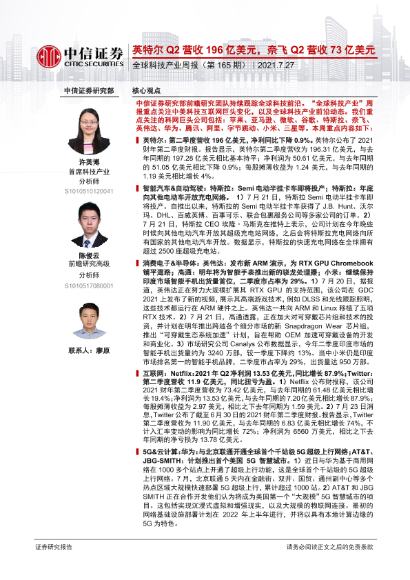 【中信证券】【20210727】全球科技产业周报(第165期):英特尔Q2营收196亿美,奈飞Q2营收73亿美元-19页
