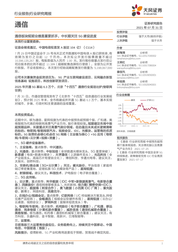 【天风证券】【20210731】通信行业研究周报:通信板块短期业绩是重要抓手,中长期关注5G建设进度-12页