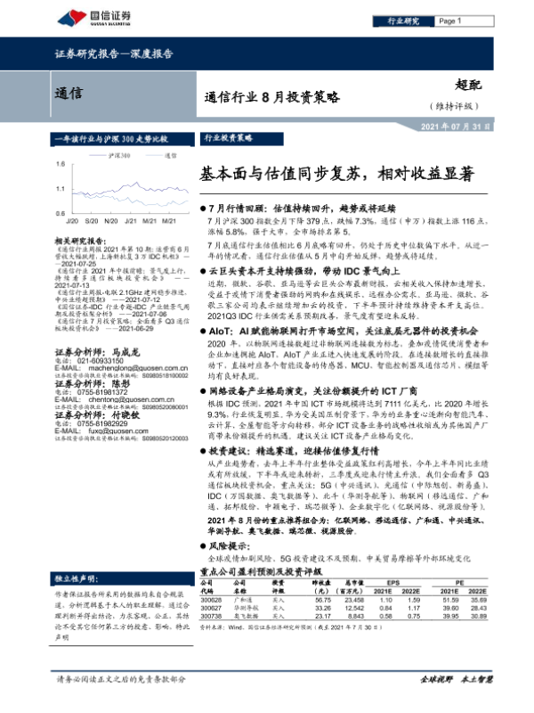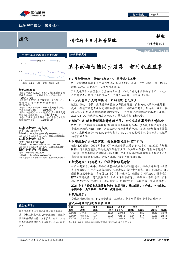 【国信证券】【20210731】通信行业8月投资策略:基本面与估值同步复苏,相对收益显著-15页