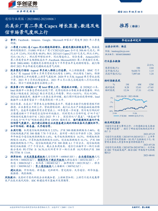 【华创证券】【20210808】通信行业周报:北美云厂商二季度Capex增长显著,数通及电信市场景气度双上行-19页