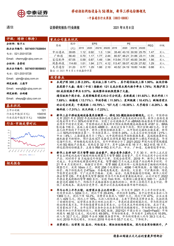 【中泰证券】【20210808】中泰通信行业周报:移动招标网络设备与5G模组,新华三移远份额领先-17页