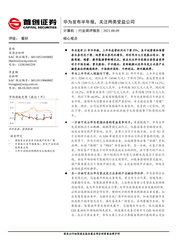 【首创证券】【20210809】20210809-首创证券-计算机行业简评报告:华为发布半年报,关注两类受益公司-3页