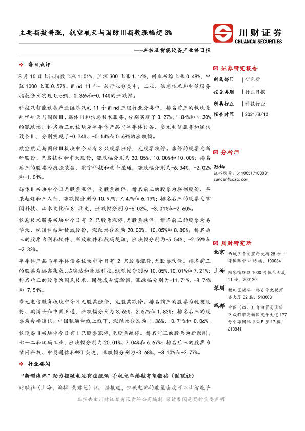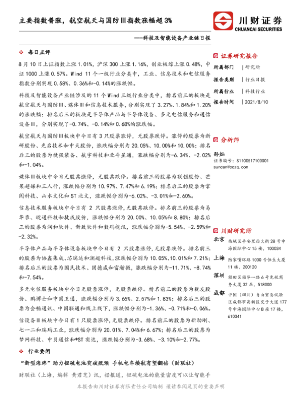 【川财证券】【20210810】科技及智能设备产业链日报:主要指数普涨,航空航天与国防Ⅲ指数涨幅超3%-4页
