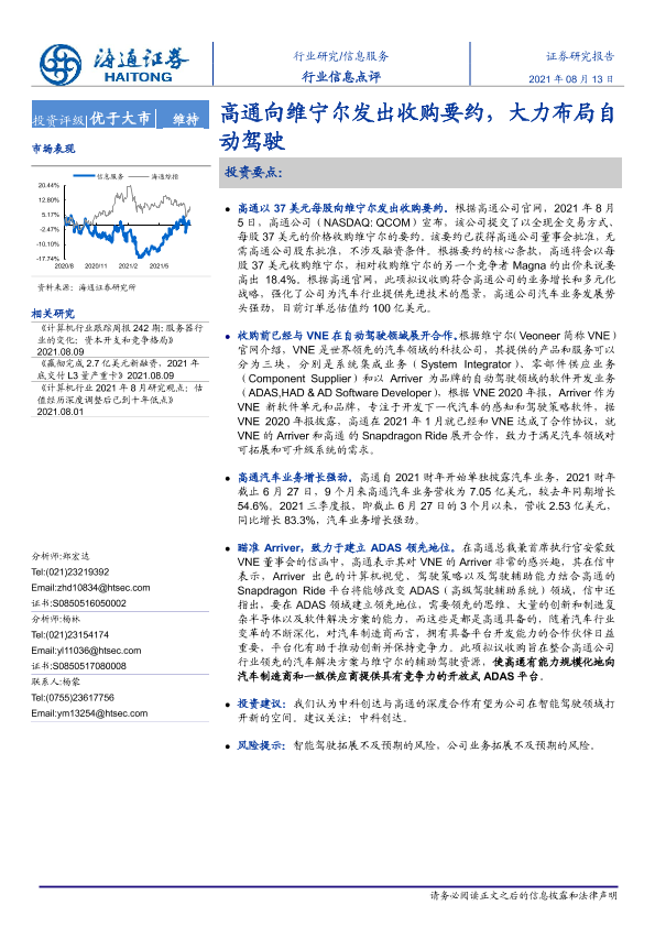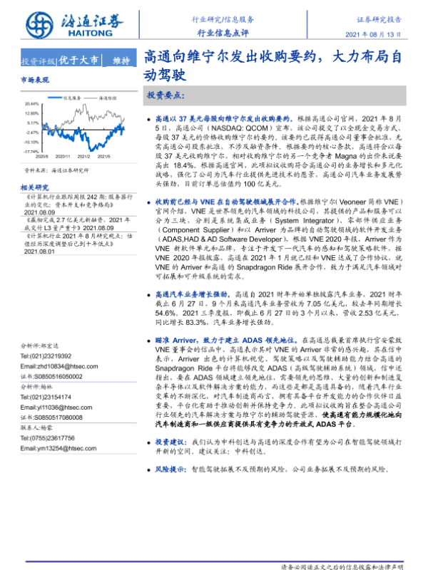 【海通证券】【20210813】信息服务行业信息点评:高通向维宁尔发出收购要约,大力布局自动驾驶-2页