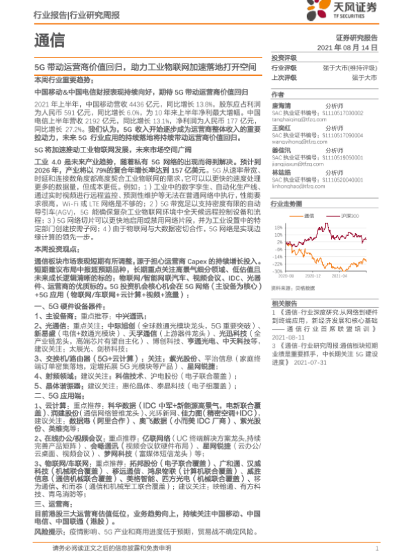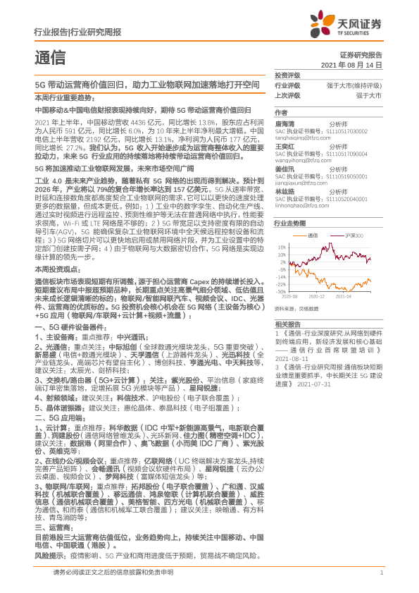 【天风证券】【20210814】通信行业研究周报:5G带动运营商价值回归,助力工业物联网加速落地打开空间-14页