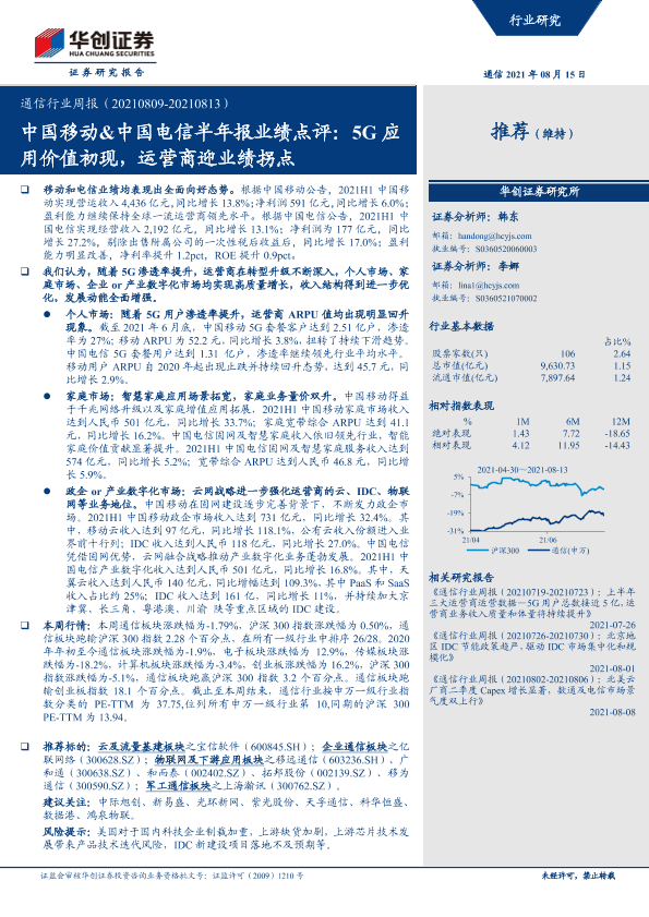 【华创证券】【20210815】20210815-华创证券-通信行业周报:中国移动&中国电信半年报业绩点评:5G应用价值初现,运营商迎业绩拐点-21页