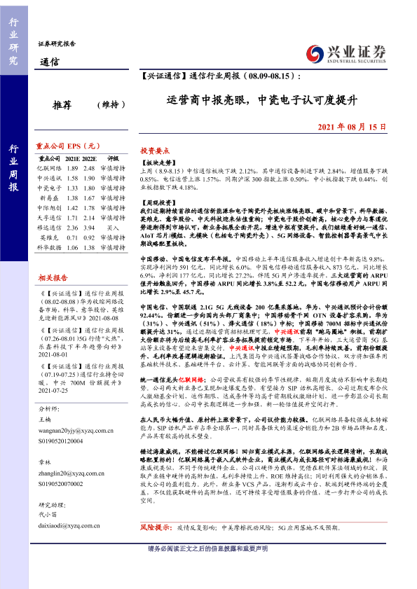 【兴业证券】【20210815】通信行业周报(08.09-08.15):运营商中报亮眼,中瓷电子认可度提升-24页