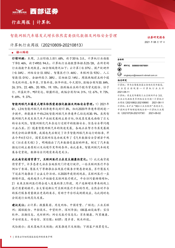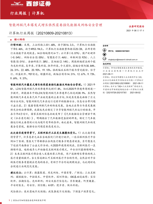 【西部证券】【20210817】计算机行业周报:智能网联汽车爆发式增长依然需要强化数据及网络安全管理-15页