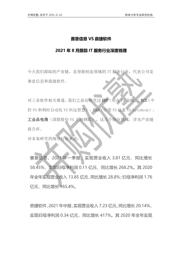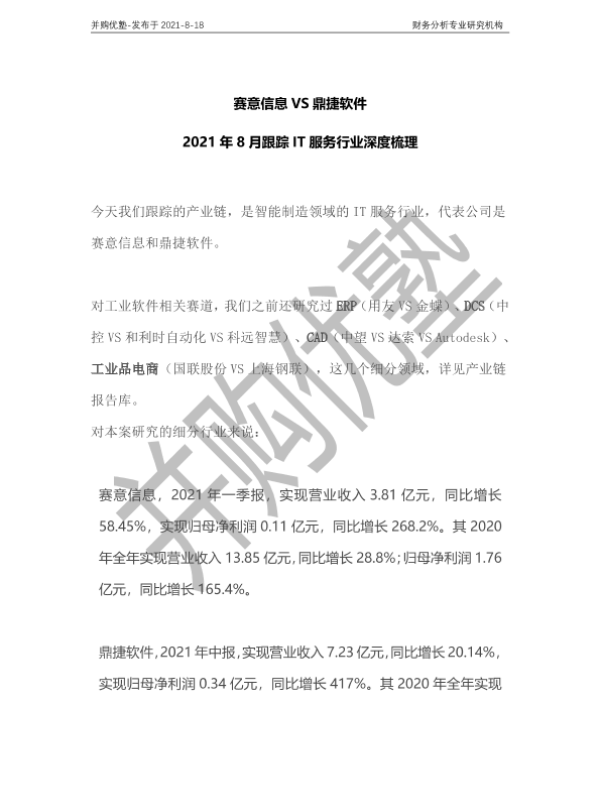 【并购优塾】【20210818】2021年8月跟踪IT服务行业深度梳理:赛意信息VS鼎捷软件-19页