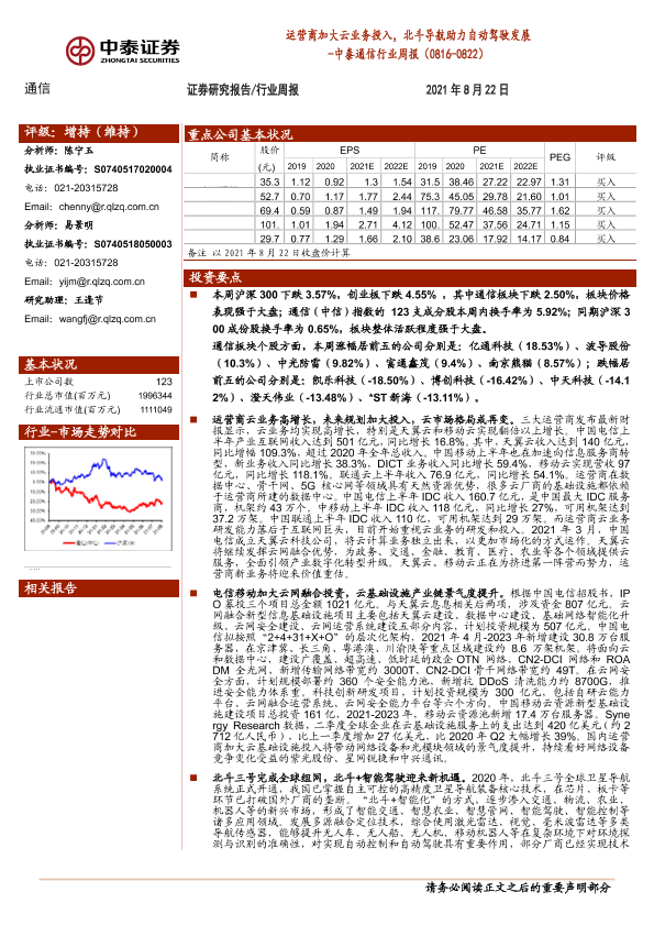 【中泰证券】【20210822】中泰通信行业周报:运营商加大云业务投入,北斗导航助力自动驾驶发展-15页