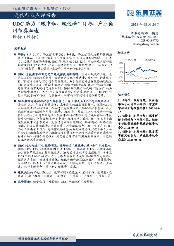 【东吴证券】【20210824】通信行业点评报告:UDC助力“碳中和、碳达峰”目标,产业商用节奏加速-2页