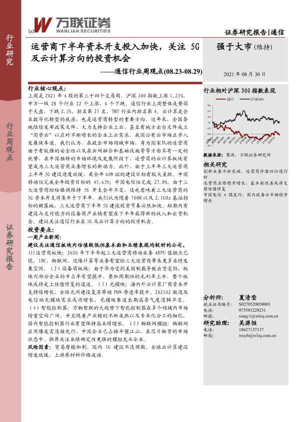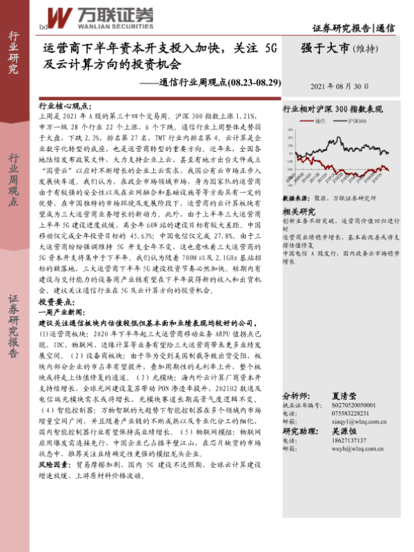 【万联证券】【20210830】通信行业周观点:运营商下半年资本开支投入加快,关注5G及云计算方向的投资机会-12页
