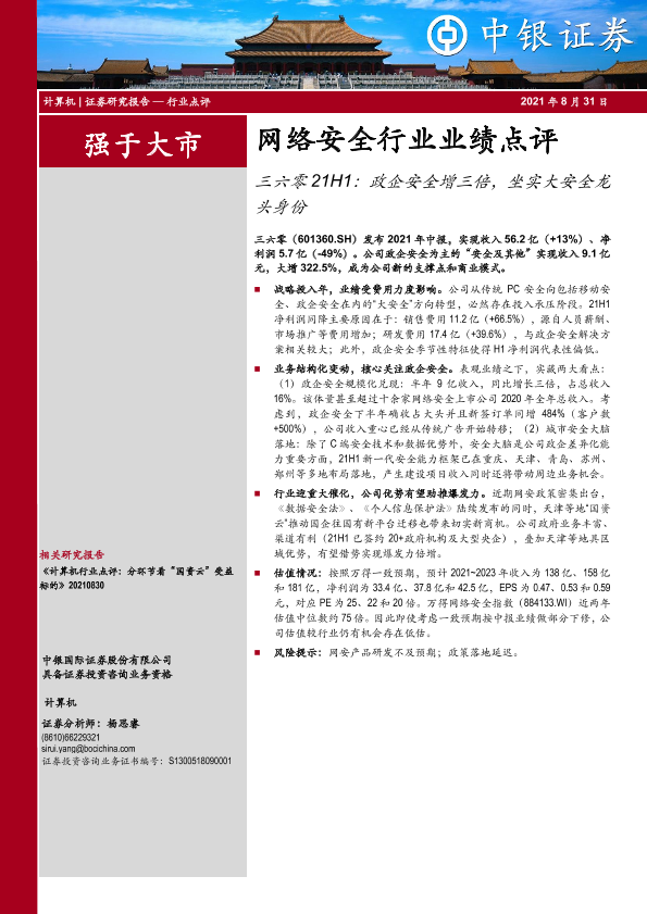 【中银证券】【20210831】20210831-中银证券-网络安全行业业绩点评:三六零21H1:政企安全增三倍,坐实大安全龙头身份-3页