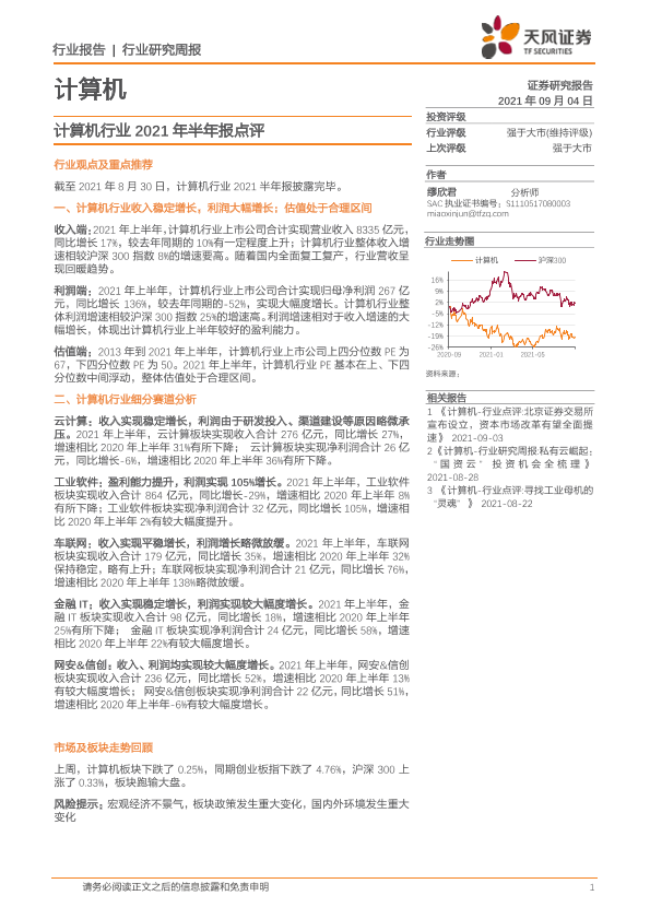 【天风证券】【20210904】计算机行业2021年半年报点评-12页