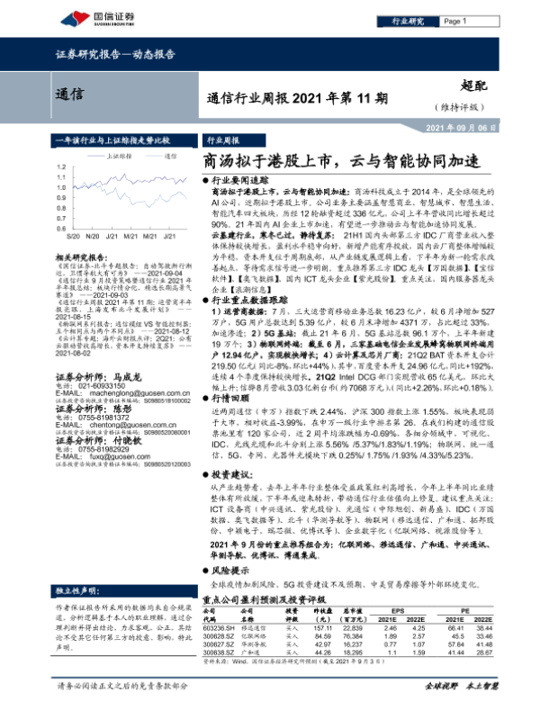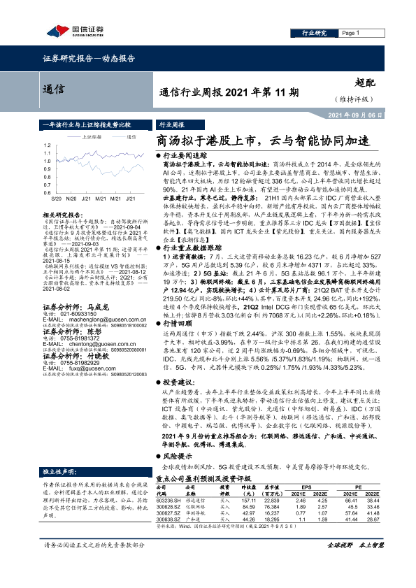【国信证券】【20210906】通信行业周报2021年第11期:商汤拟于港股上市,云与智能协同加速-18页