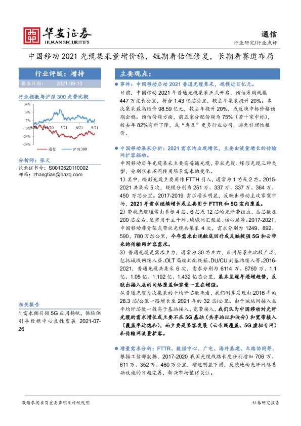 【华安证券】【20210910】20210910-华安证券-通信行业点评:中国移动2021光缆集采量增价稳,短期看估值修复,长期看赛道布局-5页