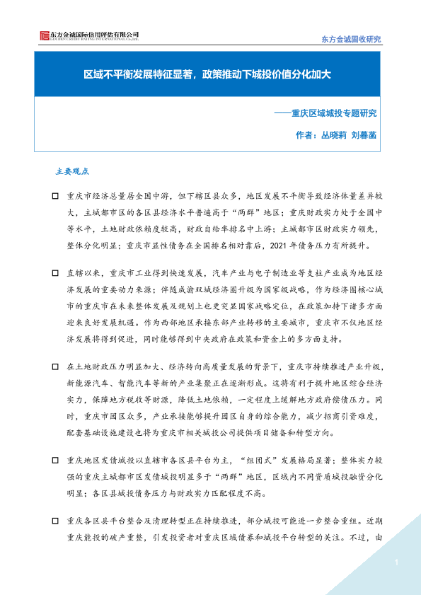 【东方金诚】【20220927】重庆区域城投专题研究:区域不平衡发展特征显著,政策推动下城投价值分化加大-25页
