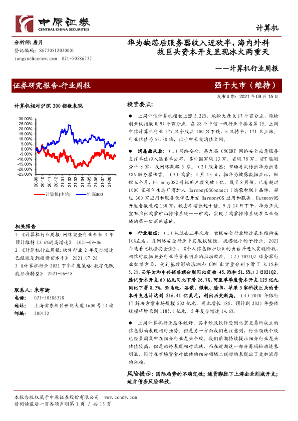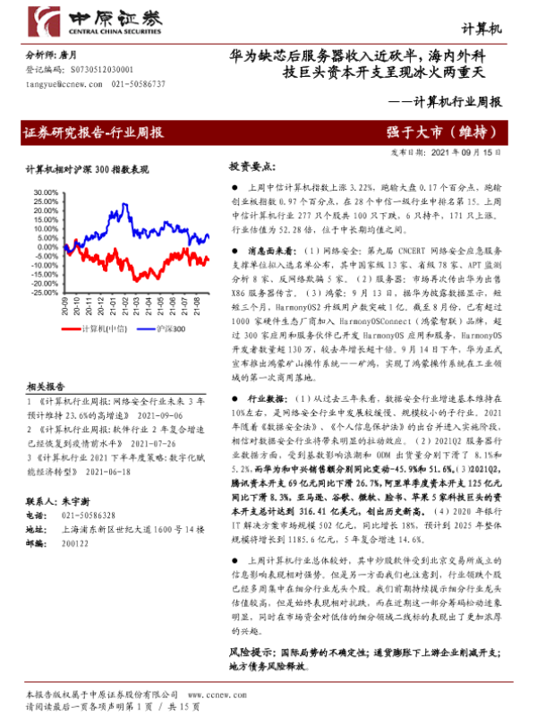 【中原证券】【20210915】计算机行业周报:华为缺芯后服务器收入近砍半,海内外科技巨头资本开支呈现冰火两重天-15页