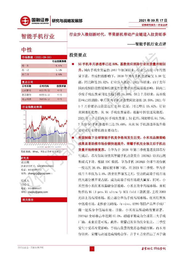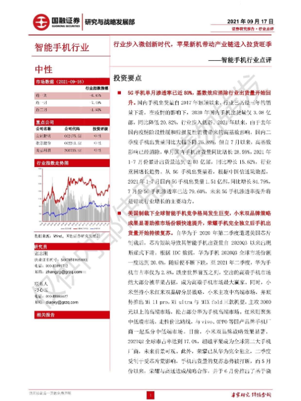 【国融证券】【20210917】20210917-国融证券-智能手机行业点评:行业步入微创新时代,苹果新机带动产业链进入拉货旺季-3页