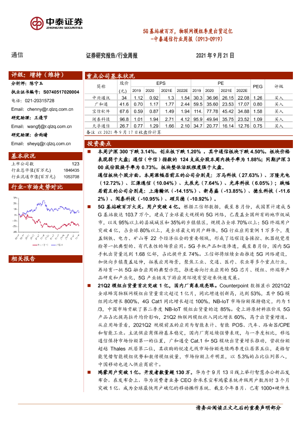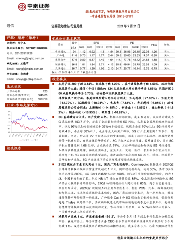 【中泰证券】【20210921】5G基站破百万,物联网模组季度出货过亿 -中泰通信行业周报(0913-0919)-13页