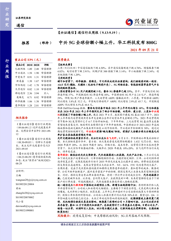 【兴业证券】【20210921】通信行业周报(9.13-9.19):中兴5G全球份额小幅上升,华工科技发布800G-26页