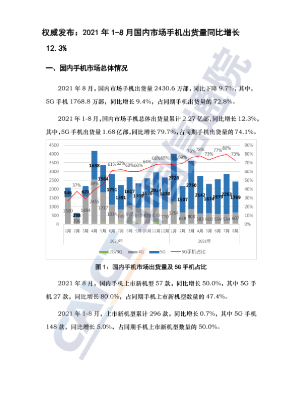 【中国信通院】【20210923】手机行业权威发布:2021年1-8月国内市场手机出货量同比增长12.3%-3页