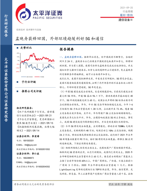 【太平洋证券】【20210925】20210925-太平洋-通信设备Ⅲ行业周报:孟晚舟获释回国,外部环境趋缓利好5G和通信-19页