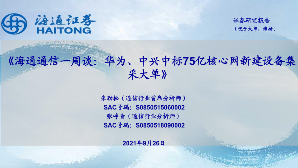 【海通证券】【20210926】海通通信行业一周谈:华为、中兴中标75亿核心网新建设备集采大单-12页