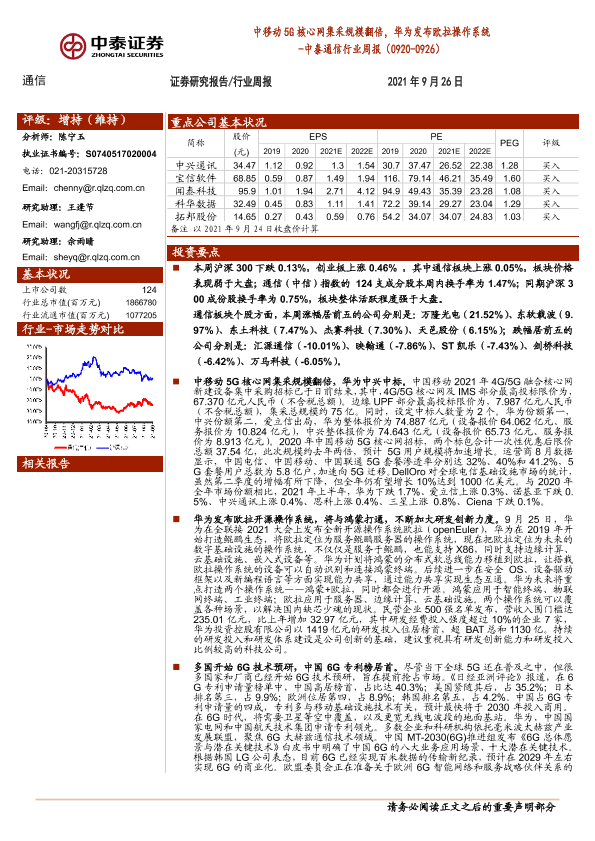 【中泰证券】【20210926】中泰通信行业周报:中移动5G核心网集采规模翻倍,华为发布欧拉操作系统-12页