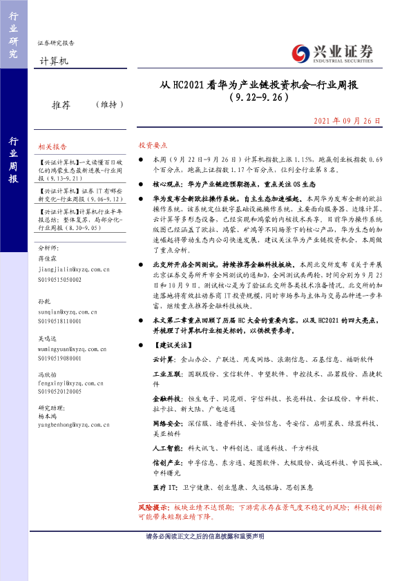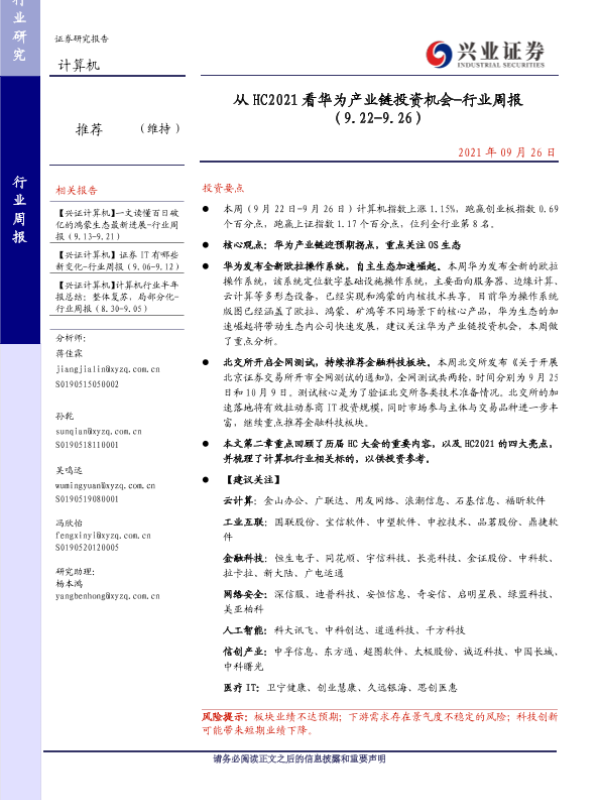 【兴业证券】【20210926】从 HC2021看华为产业链投资机会-行业周报 (9.22-9.26)-29页