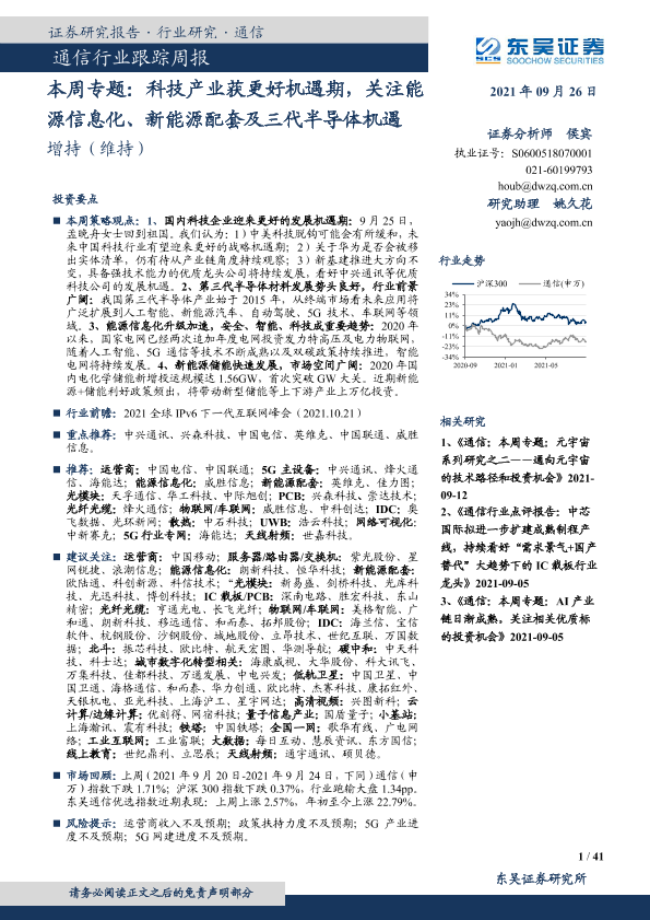 【东吴证券】【20210926】通信行业跟踪周报-本周专题:科技产业获更好机遇期,关注能源信息化、新能源配套及三代半导体机遇-41页