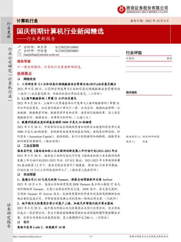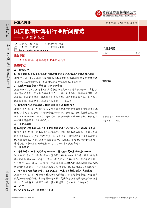 【浙商证券】【20211006】20211006-浙商证券-计算机行业更新报告:国庆假期计算机行业新闻精选-3页