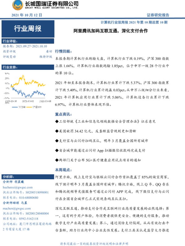 【长城国瑞证券】【20211012】计算机行业双周报2021年第10期总第10期:阿里腾讯加码互联互通,深化支付合作-8页