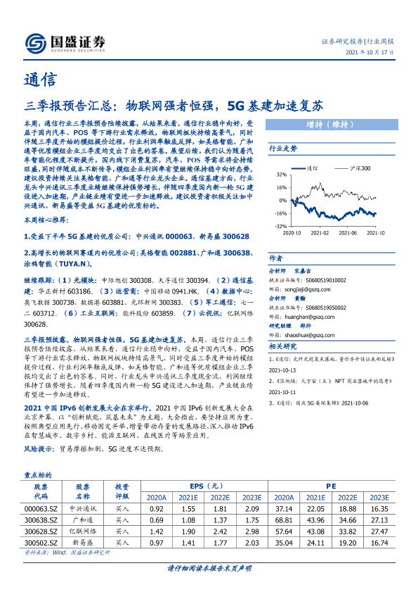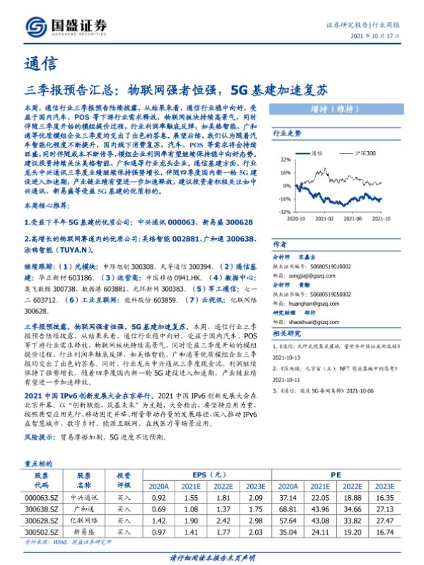 【国盛证券】【20211017】通信行业周报:三季报预告汇总:物联网强者恒强,5G基建加速复苏-11页
