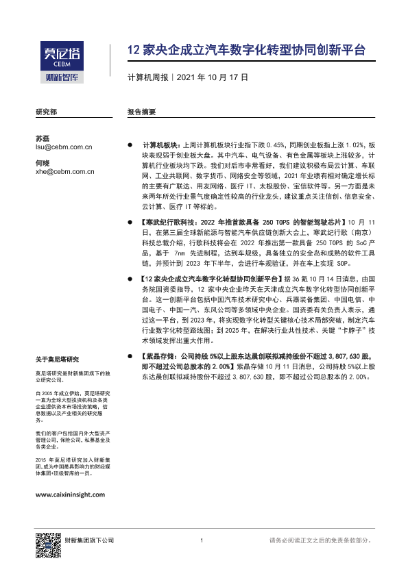 【莫尼塔研究】【20211017】计算机周报:12家央企成立汽车数字化转型协同创新平台-7页