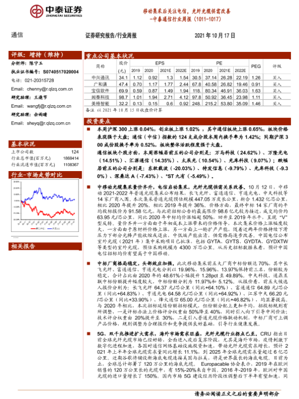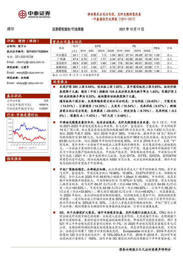 【中泰证券】【20211017】中泰通信行业周报:移动集采后关注电信,光纤光缆供需改善-14页