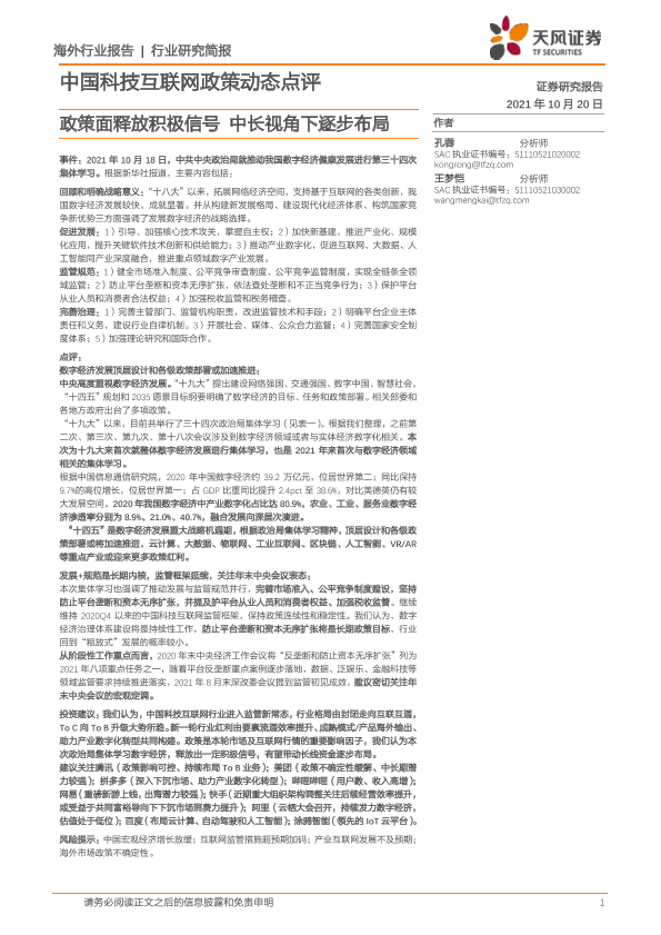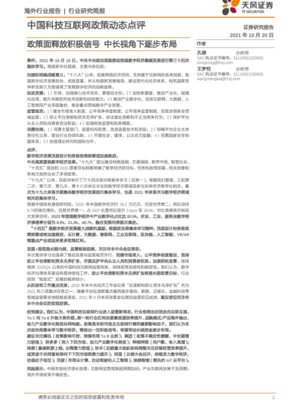 【天风证券】【20211020】中国科技互联网政策动态点评:政策面释放积极信号 中长视角下逐步布局-5页