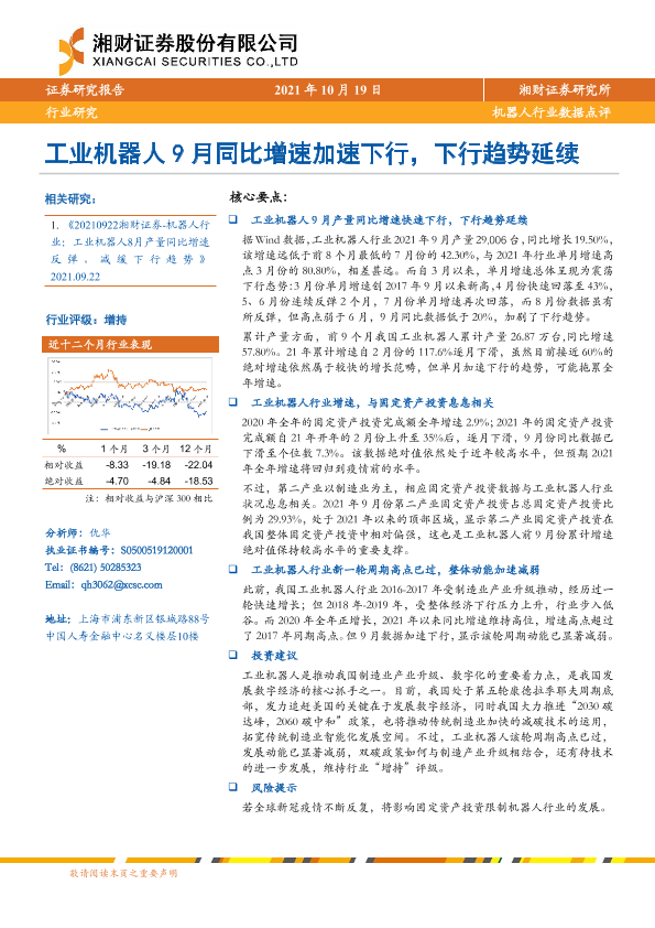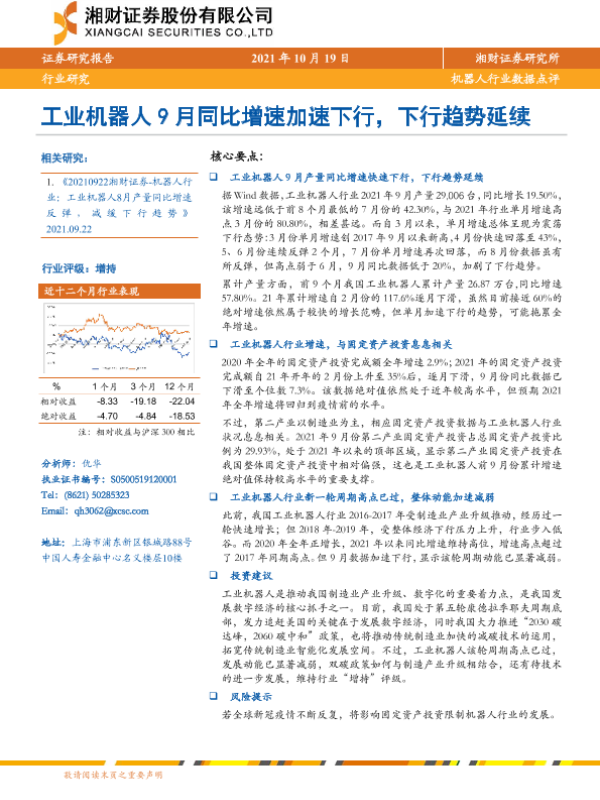 【湘财证券】【20211019】机器人行业数据点评:工业机器人9月同比增速加速下行,下行趋势延续-4页