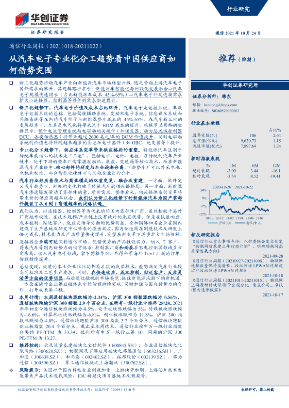 【华创证券】【20211024】通信行业周报:从汽车电子专业化分工趋势看中国供应商如何借势突围-26页