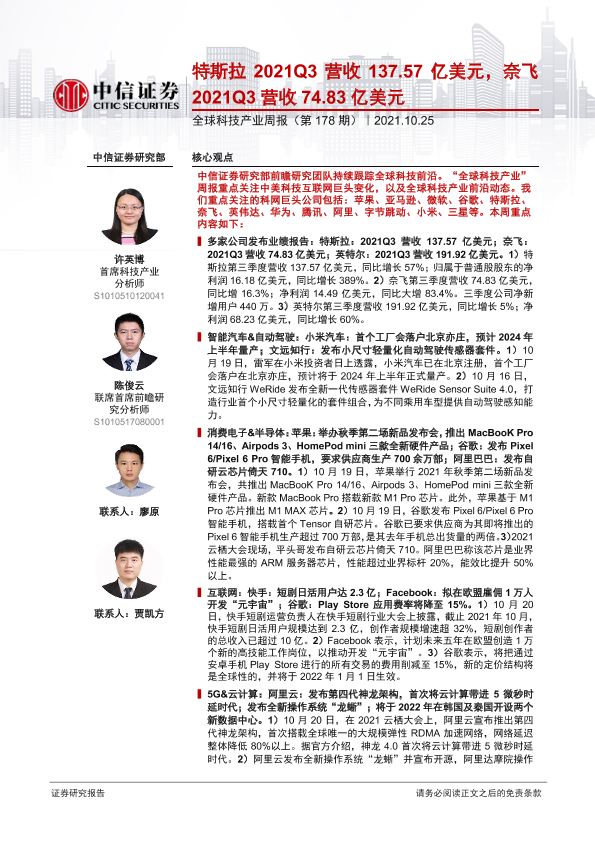【中信证券】【20211025】全球科技产业周报(第178期):特斯拉2021Q3营收137.57亿美元,奈飞2021Q3营收74.83亿美元-14页