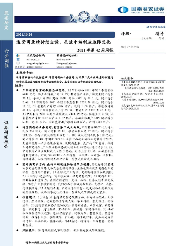 【国泰君安证券】【20211024】通信设备及服务行业2021年第42周周报:运营商业绩持续企稳,关注中端制造边际变化-17页