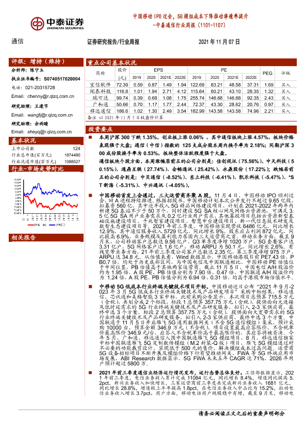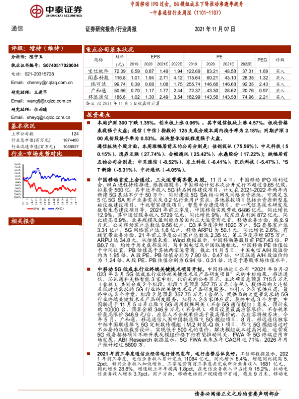【中泰证券】【20211107】中泰证券-中泰通信行业周报:中国移动IPO过会,5G模组成本下降推动渗透率提升-12页