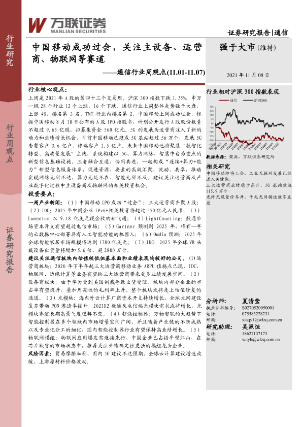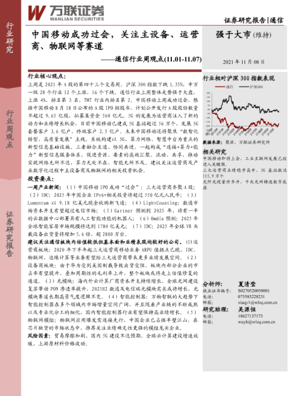 【万联证券】【20211108】20211108-万联证券-通信行业周观点:中国移动成功过会,关注主设备、运营商、物联网等赛道-11页