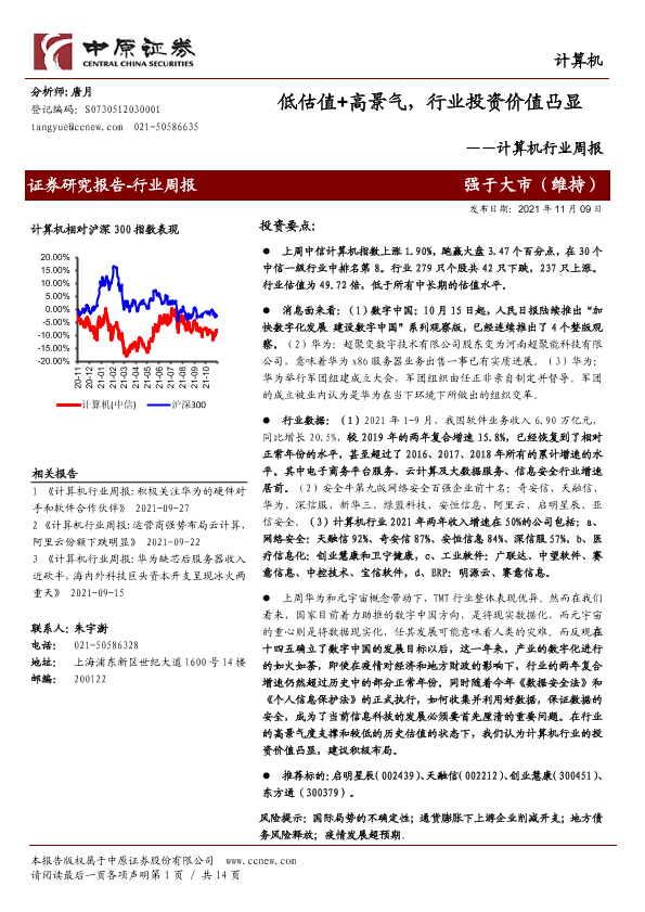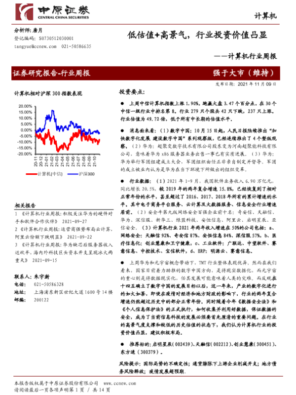 【中原证券】【20211109】计算机行业周报:低估值+高景气,行业投资价值凸显-14页